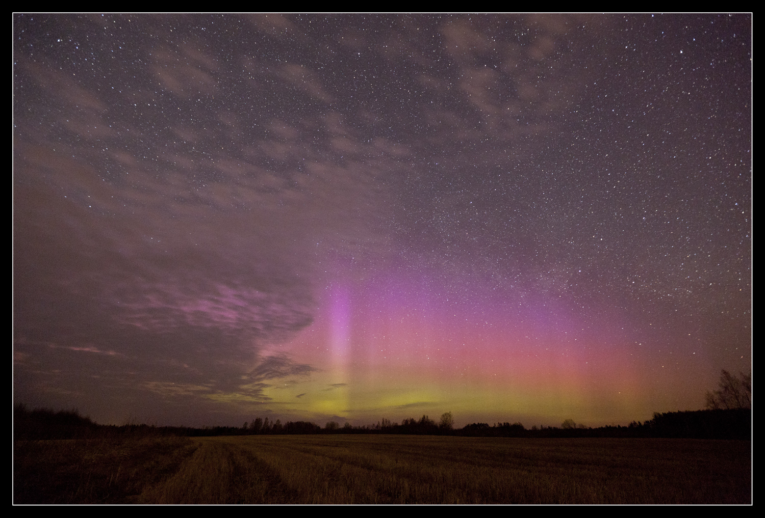 Nu re kā! brīdī kad cilvēks jau iet gulēt, pirksti tomēr niez pārbaudīt kosmisko laikapstākļu stāvokli, un še tev!! Aun nu ūziņas kājās un velcies uz pļavu… Prieki gan īsi, jo blāzma parādījās tik uz pāris minūtēm, un pēcāk debesis apmācās pilnībā.