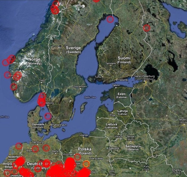Lai pārbaudītu vai EMSC seismisko datu reģistrācija vispār strādā, paplašinām šo reģionu mazliet lielāku, izvēlamies datus par pēdējo gadu (no 2011 gada 23.novembra) un redzam pēdējā gada seismisko notikumu ainu. Reģions ap Baltijas valstīm acīm redzami izceļas ar to ka šeit pēdējā gada laikā vispār nav reģistrētas zemestrīces. 🙂