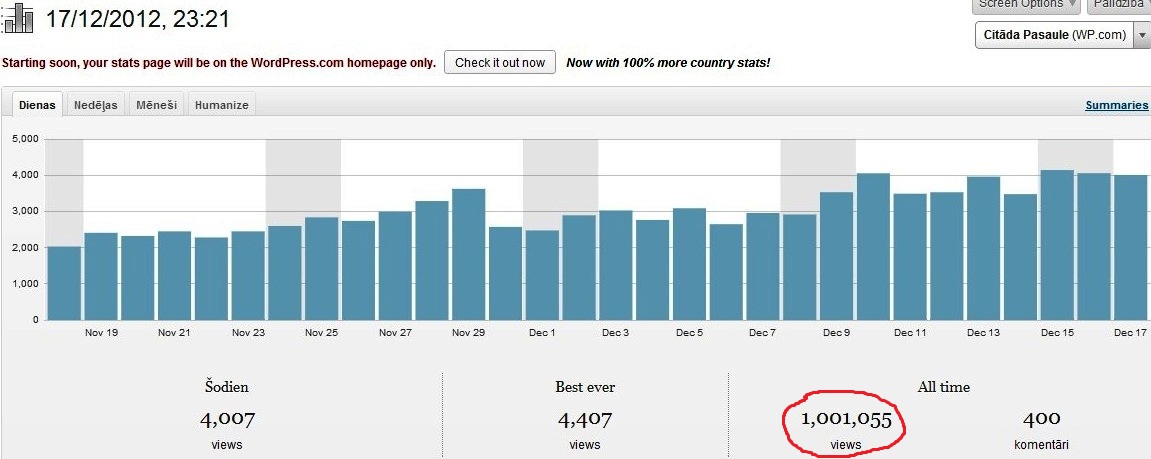 “Pasaules galiņš” vel nav pienācis, bet blogs pēc 2 gadu ilgas pastāvēšanas, šodien pārsniedzis 1 miljona reižu skatījumu slieksni.