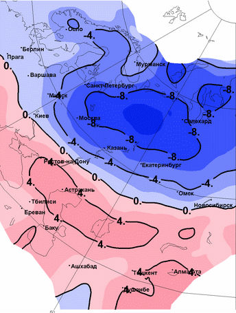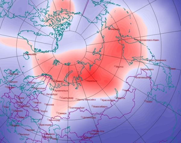 Kā redzams kartē, sarkani iekrāsotās zonas norāda uz zemas temperatūras gaisa masām. Parasti ziemas beigās auksto gaisa masu centrs izvietots virs ziemeļpola, bet robeža ir virs Krievijas vidējiem platuma grādiem, Grenlandes un Kanādas. Taču redzams, ka šobrīd izveidojusies liela nobīde, praktiski viss ziemeļu puslodes aukstais gaiss koncentrējies virs Krievijas. Vislielākā anomālija vērojama Sibīrijas ziemeļos, bet arktiskā gaisa atsevišķi atzari skar Eiropas austrumus un Jakutiju.
