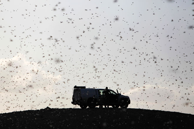 Rijīgie kukaiņi iebrukuši Izraēlas dienvidu rajonos. Varas iestādes ieteikušas iedzīvotājiem palikt mājās un cieši aizvērt logus un žalūzijas. Vislielākās briesmas draud daudzajām lauksaimniecības platībām Nehevas provincē. Patlaban cietuši tikai kartupeļu stādījumi, bet redīsi un tomāti, kas atradušies zem mitrumu saglabājošas agroplēves, palikuši neskarti.