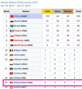 Interesanta sakritība ar “Event 201″(Skat. “Event 2019” 1.daļa “Mēs neesam gatavi!”). Tajā pašā dienā, bet citā pasaules malā, Ķīnā Uhaņā, 2019 gada 18.oktobrī tiek tiek atklātas 2019.gada Pasaules karavīru sporta spēles ar moto “Militārā slava un miers visā pasaulē” (skat. 2019 Military World Games). Arī mūsējie arī tur startēja un starp citu, parādīja labus rezultātus. Citēju: “21.oktobrī Latvijas šosejas riteņbraucējs zemessargs Andris Vosekalns izcīnīja otro vietu Ķīnas Tautas Republikā notiekošajās Pasaules karavīru sporta spēlēs, savukārt komandu vērtējumā Latvijas sportisti ieguva zelta godalgu” (skat. Aizsardzības nozare vadība apbalvo Pasaules karavīru sporta spēļu dalībniekus). Video mūsējie soļo 35 minūtē.